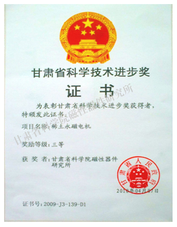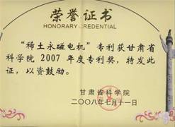 "稀土永磁電機(jī)"專利獲獎證書